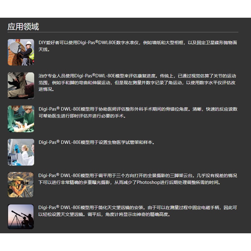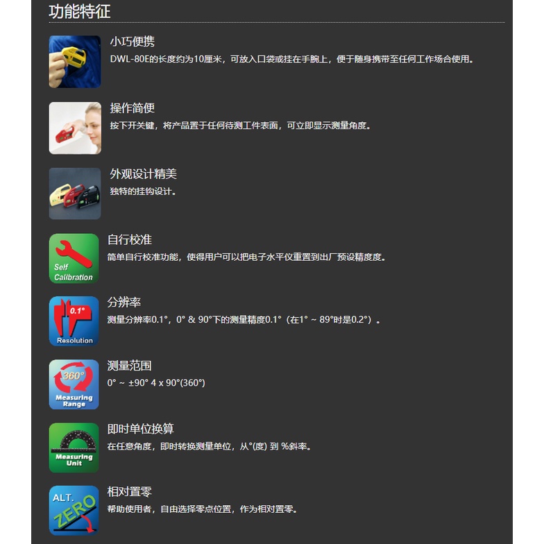 DWL-80E系列是一款袖珍型電子水平儀,精美,小巧,便攜且實用;其LCD數顯角度,快速,清晰,精確;其外殼由堅固,耐摔的ABS工程塑料與鋁制基座合模制成,並內置磁鐵;適合業余和專業人士在各種場合使用。
