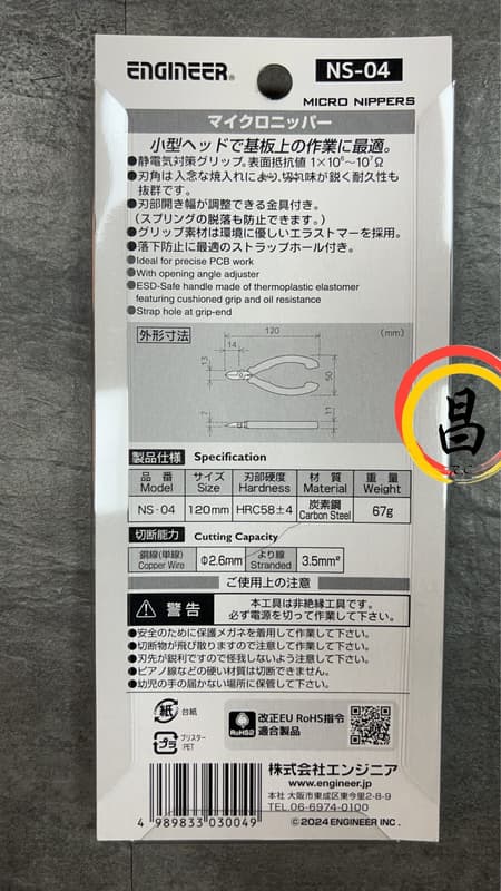 日昌五金 含稅 日本 ENGINEER 防靜電斜口鉗 115mm NS-04 精密電子彈簧 開口可調斜口鉗