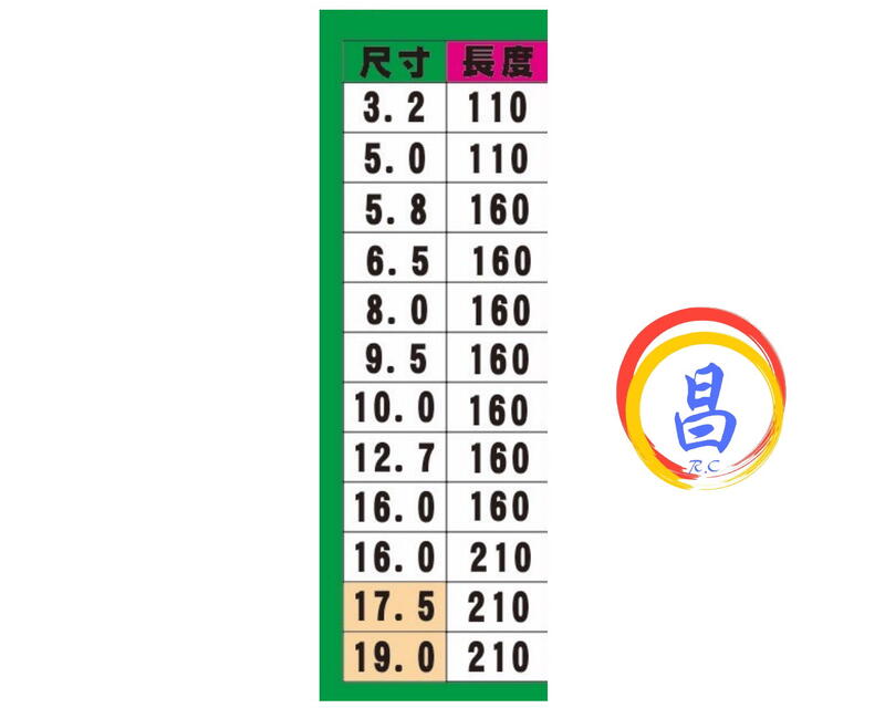 3.2*110mm, 5.0*110mm, 5.8*160mm, 6.5*160mm, 8.0*160mm, 9.5*160mm, 10*160mm, 12.7*160mm, 16*160mm