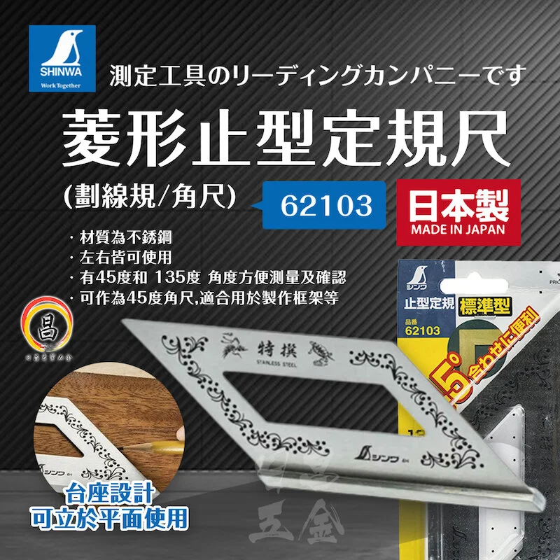 – 材質為不銹鋼 – 左右皆可使用 – 有45˚和 135˚ 角度方便測量及確認 – 台座設計可立於平面使用 – 可作為45度角尺,適合用於製作框架等