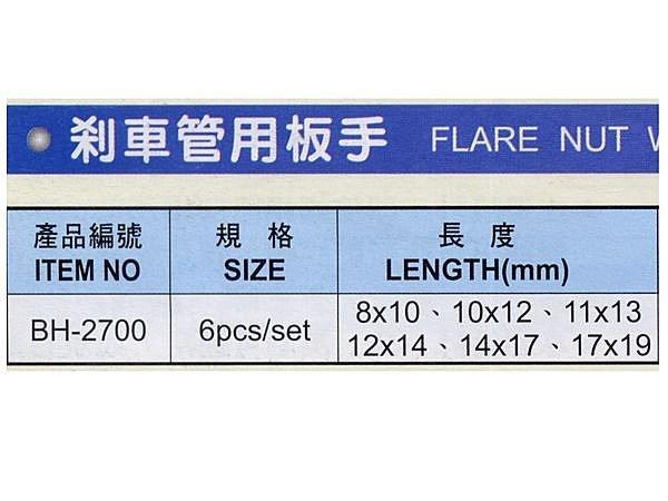 黑手專賣店 附發票 台灣製 黑手牌 鉻釩綱製 煞車管用板手 煞車管板手 油管板手 型號 : BH-2700 quantity