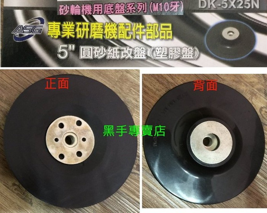 4吋砂輪機轉5吋自黏式砂紙轉換盤 單片直購價158元 (AS)圖中砂輪機 為示範用 如有需要歡迎詢價!!型號 : DK-5X25N底盤尺寸 5″ (125mm)一般4″砂輪機 M10螺牙的都可以安裝 (市面上販售的大都是這個規格的 ) . 裝上後就可以拿來當5吋自黏式砂紙研磨機!!研磨時務必注意安全.佩戴防護具!!