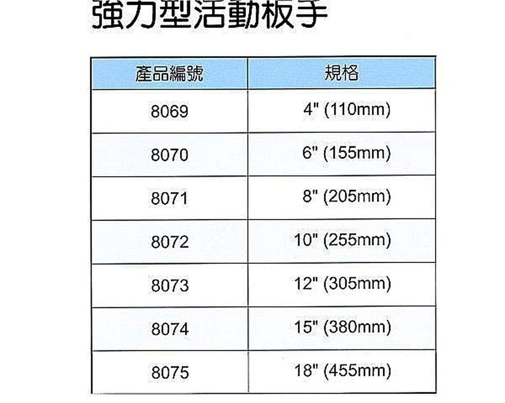 (1)   4″ 型號:8069  直購價 662元  開口最大13MM           6″ 型號:8070      存    683件  開口最大20MM          8″ 型號:8071      存    756件  開口最大27MM         10″ 型號:8072      存    998件  開口最大30MM         12″ 型號:8073      存  1418 件  開口最大34MM                                全買共5支 可優惠歡迎詢問價格  (2)商品說明及用途描述 1888年
