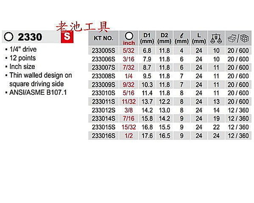 商品: 2330S套筒 型號 233005S SIZE: 5/32inch 長度24mm 商品特色: 鉻釩合金鋼,拋光,鍍鉻 4球槽定位功能 方孔外徑薄壁設計 依據 ANSI/ASME B107.1 直購價 53元 (其他尺寸歡迎參考圖2詢問價格!!) @KING TONY 世界品牌 台灣頂級工具 經歐洲聯盟 “專業” 工具認證 (ISO) Service (CE) Assurance (GS) Responsibility (VDE) Satisfaction 高品質測試標準 : 超越德國DIN標準30% 美國ANSI 50% KING TONY 套筒組所有尺寸或其他各式商品