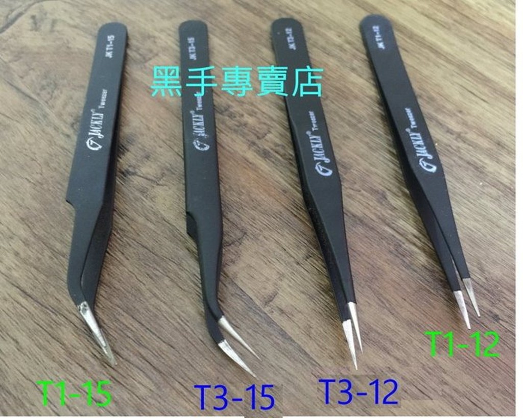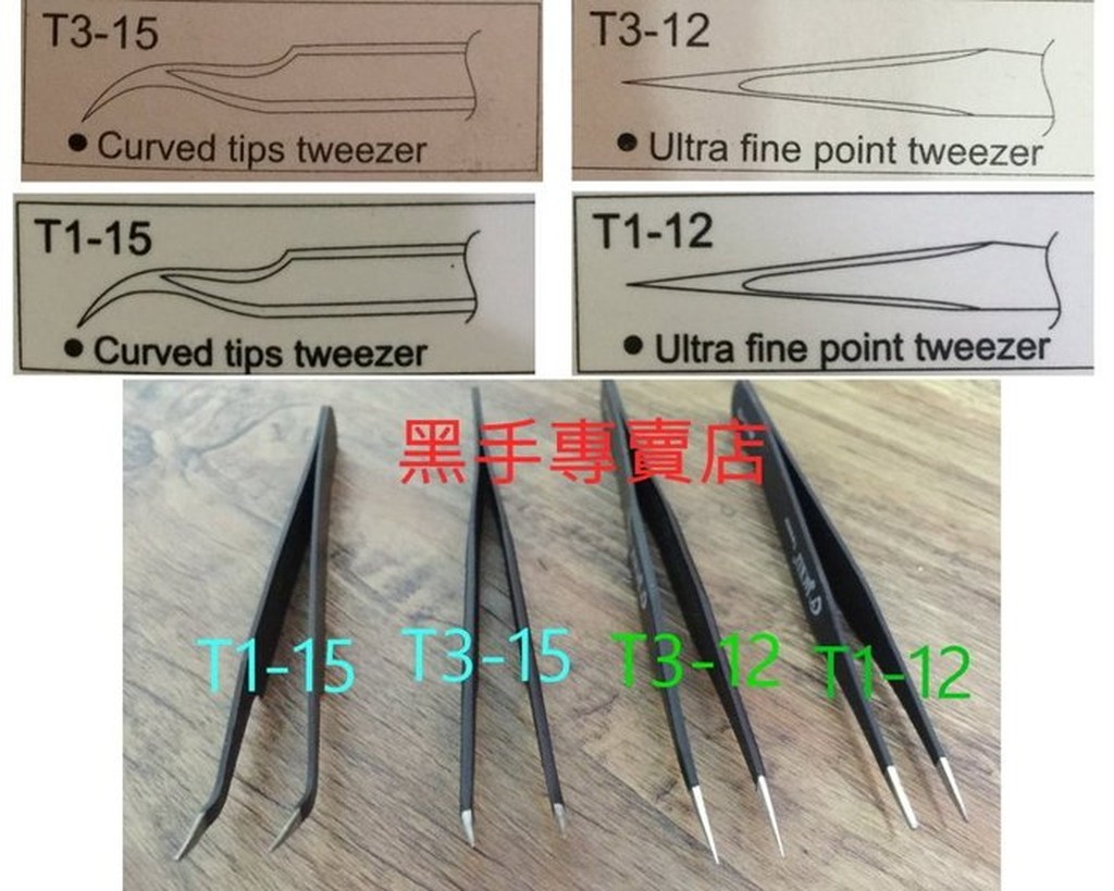 (下標時 請註明要什麼型號.沒註明採隨機出貨. T1 和 T3 二系列價錢不同!!) T1系列 防磁 耐酸 防靜電不鏽鋼彎頭鑷子  存   53   件             (V)T1系列有2種頭型 可以選擇                                T1-15 彎頭   總長度約115mm                               T1-12 直頭   總長度約115mm另有 T3系列 加強版精密夾   單支直購價  95 元   T3系列 前端 比 T1 系列 更尖更細 有2種頭型可選擇                               T3-15 彎頭   總長度約125mm    (停產)                           T3-12 直頭   總長度約125mm          防磁 耐酸 防靜電 不鏽鋼 這些特點 僅限於前端夾物品的頭端部分       手握的柄身 沒有這些特點!!